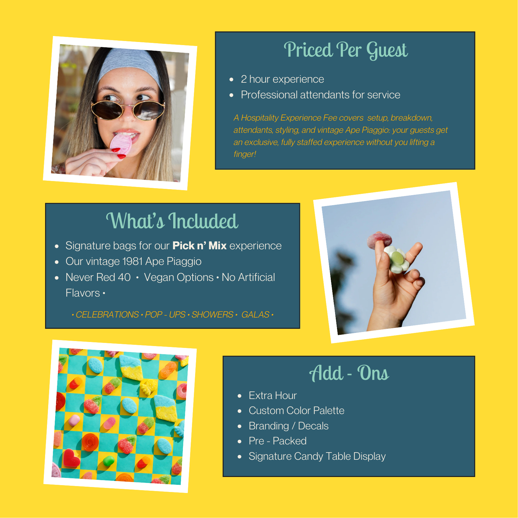 Whether you’re hosting a chic backyard soirée, planning a launch event, or creating a branded moment, we deliver a unique, high-end candy experience that feels both nostalgic and new!